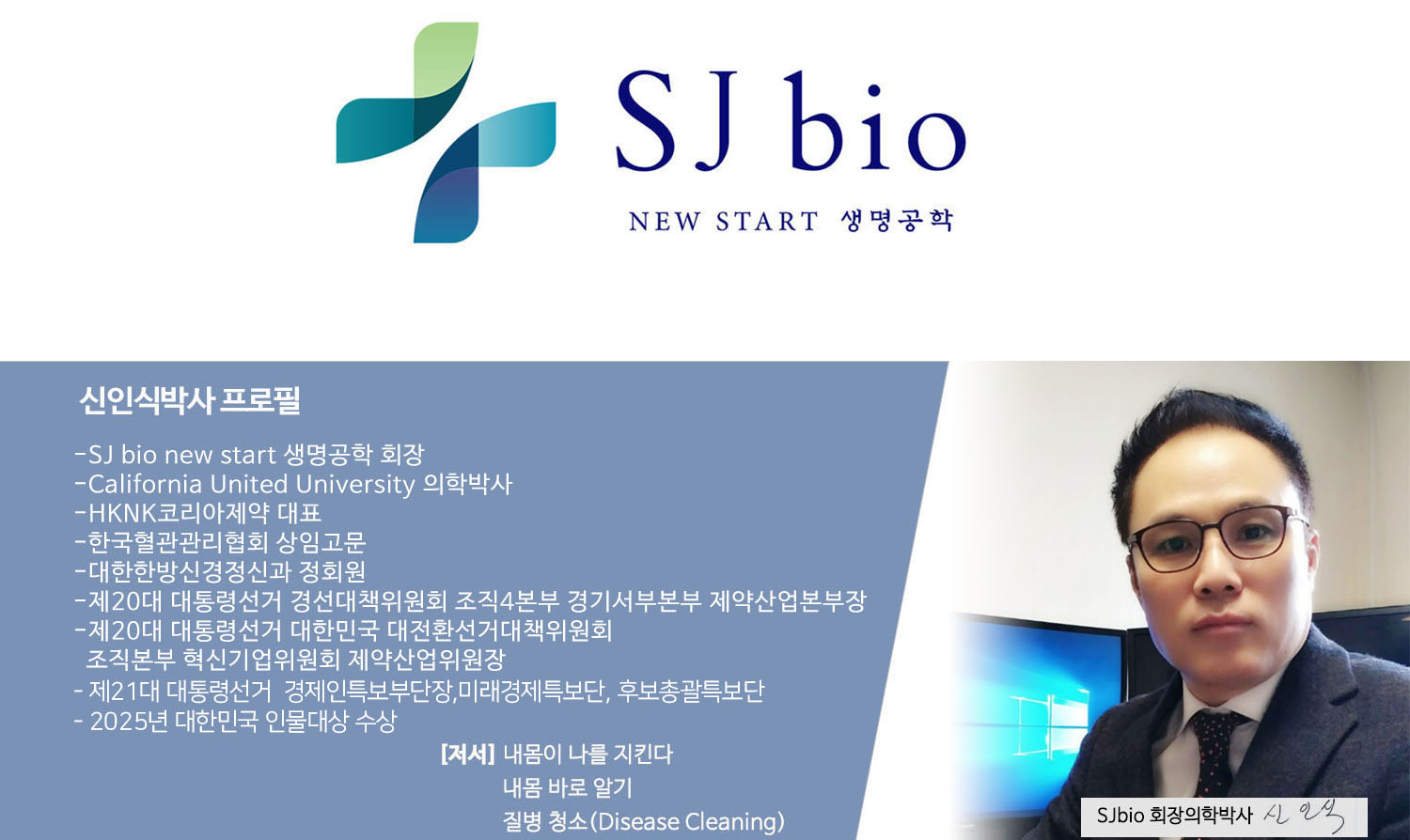 안녕하십니까! 에스제이바이오 회장 의학박사 신 인식입니다.